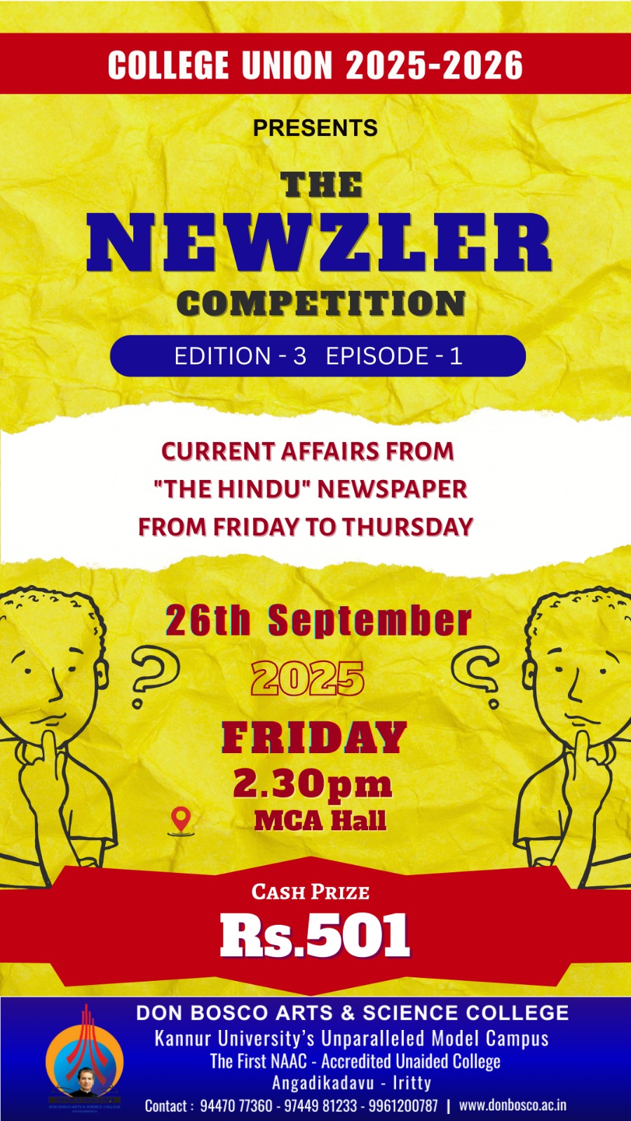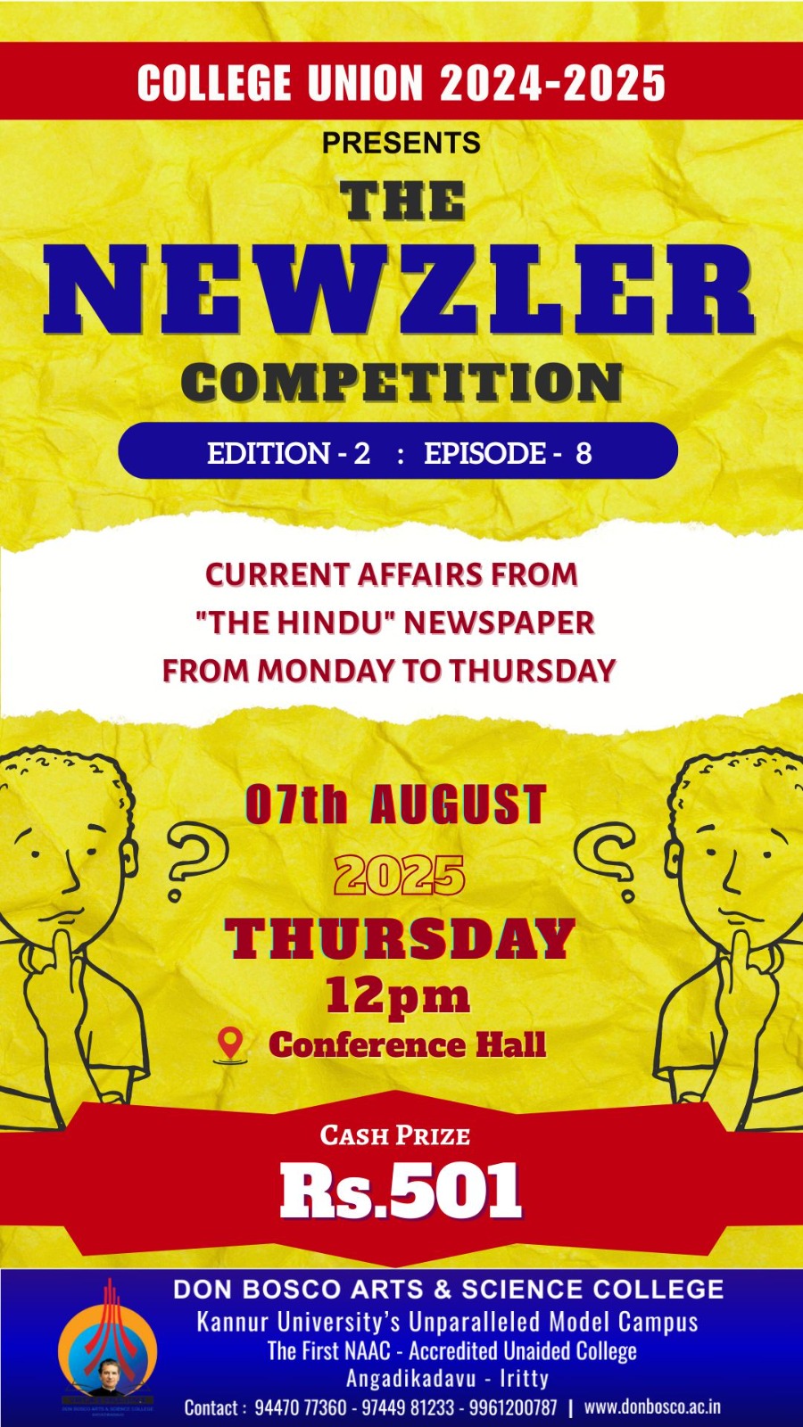 The eight episode of Second Edition of the NEWZLER Quiz Series, organised by College Union, based on The Hindu news paper will be conducted on 07-08-2025.