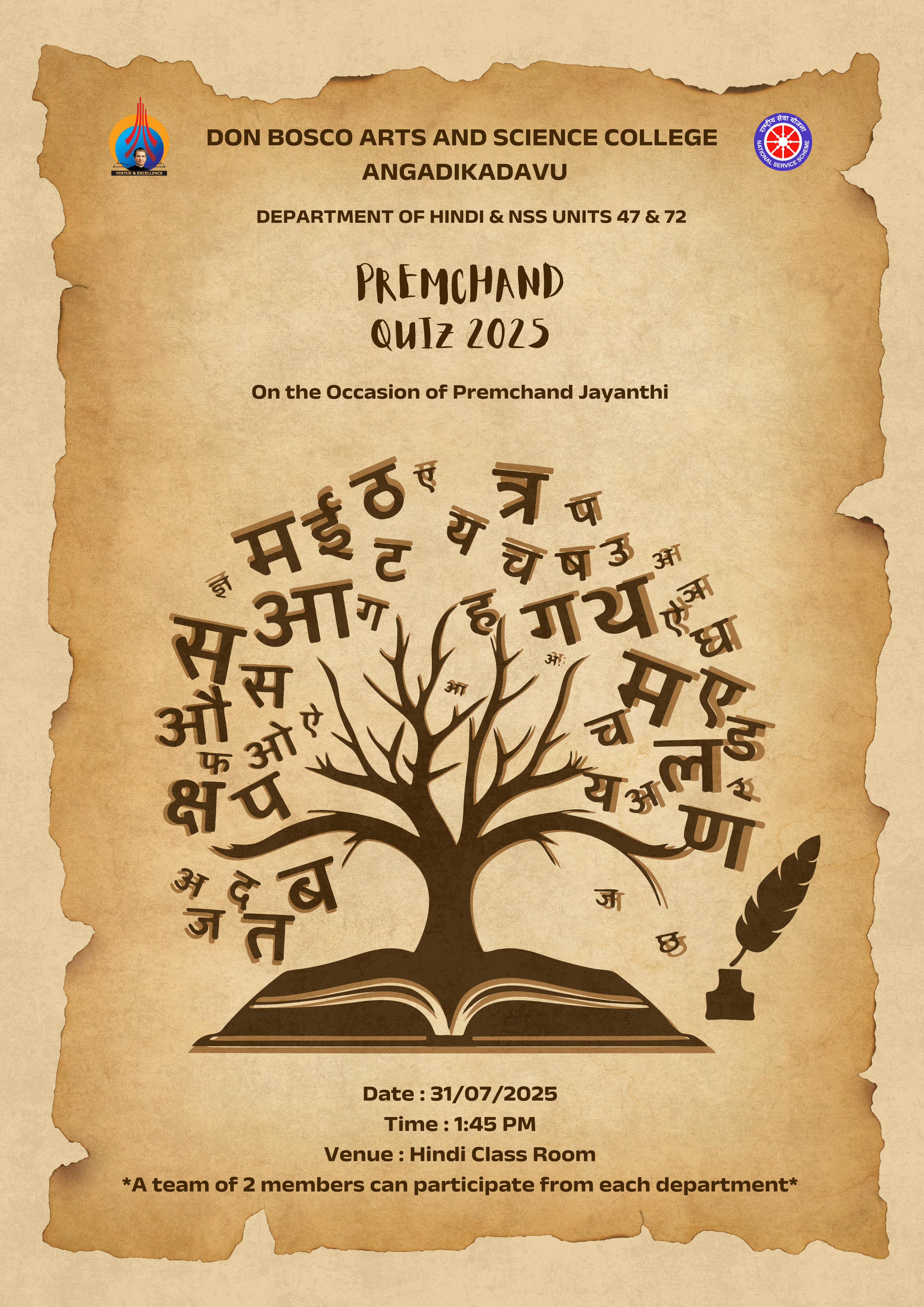 Premchand Quiz will be organised by Department of Hindi on 31-07-2025 at 1:30pm. Department of Hindi organises Premchand Quiz every year to remember to promote awareness and appreciation for the works and legacy of Munshi Premchand, a renowned Indian writer. These quizzes test and enhance knowledge about his life, literary contributions, and the social issues he addressed in his writings, ensuring his works continue to be remembered and studied.