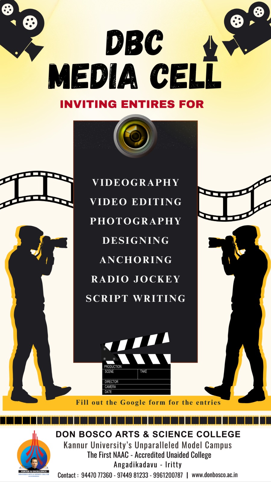 The Media Cell of Don Bosco Arts & Science College is inviting entries for various media related activities. Interested candidates may contact Department of Journalism