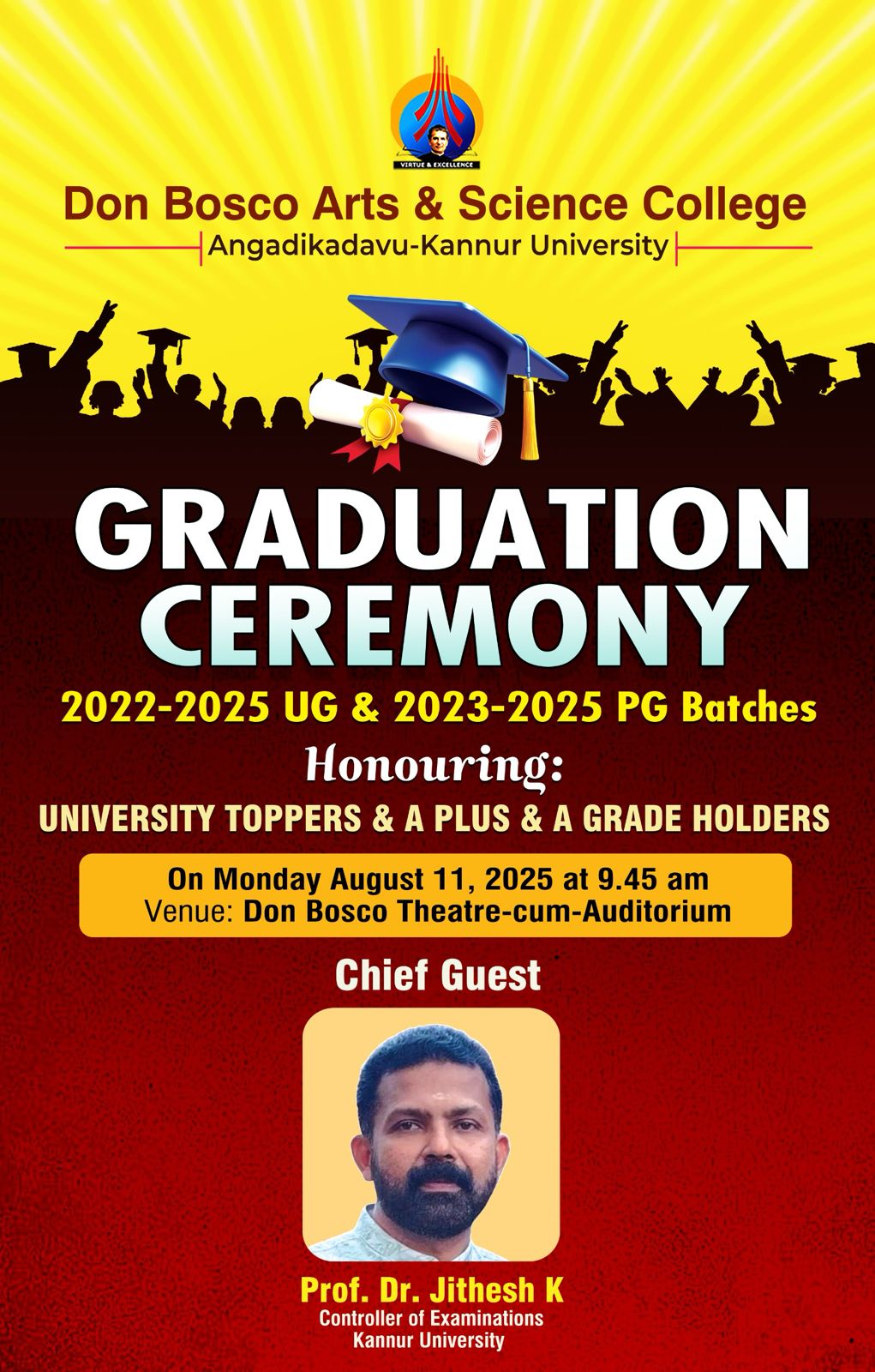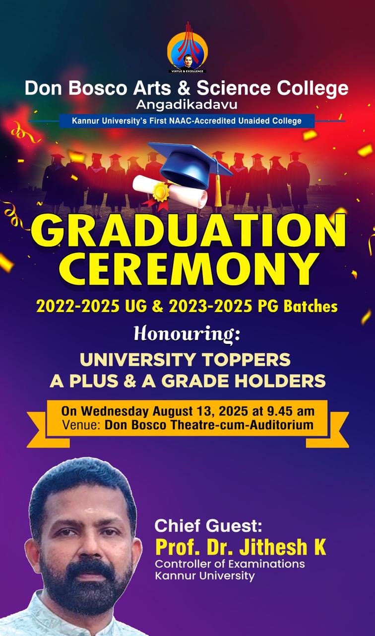 Graduation Ceremony for the 2024-2025 passed UG & PG students will be conducted on 13-08-2025. Controller of Examination, Kannur University Prof. Dr. Jithesh K will be the chief guest for the ceremony.