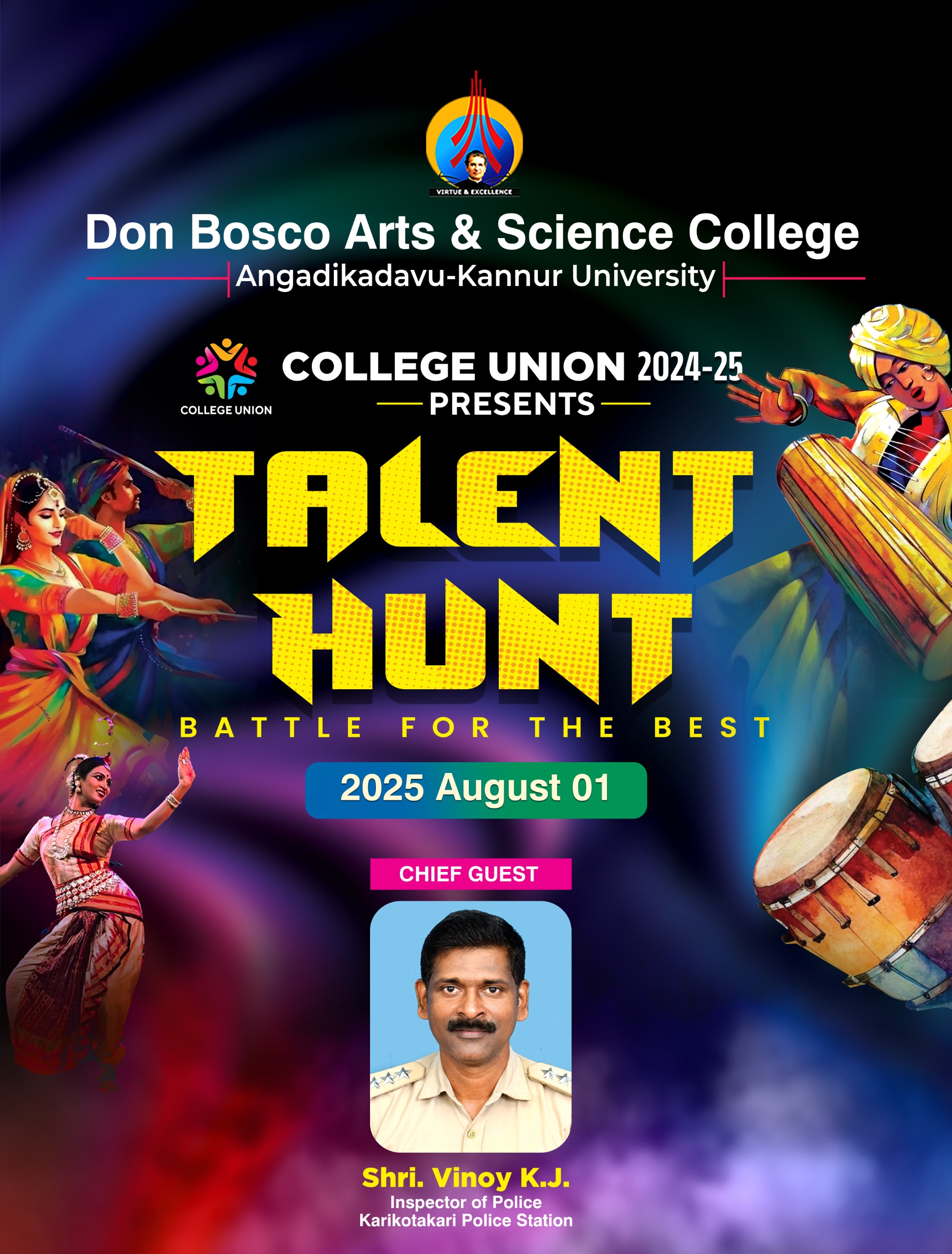 Inter-Departmental Talent Hunt for the Academic year 2025-2026 will be conducted on 01-08-2025. Inspector of Police, Karikkottakari Police Station Mr. Vinoy K.J. will be chief guest during the Inauguraa Function. The Talent Hunt is organised every year to find the hidden talents of the newly joined students of the college. College Union will be hosting the event.