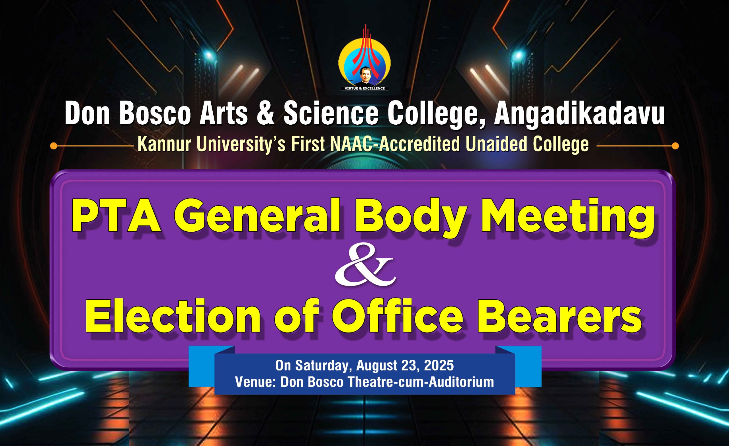 PTA General body Meeting and the Election of the office Bearers will be conducted on 23-08-2025. The programme will be conducted in the Theatre-cum-Auditorium.