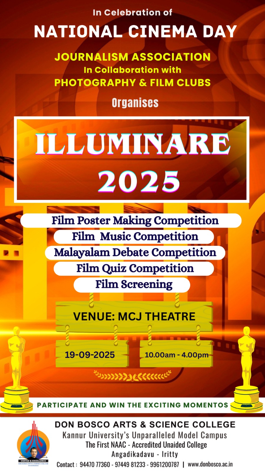 Department of Journalism is Organizing Various Events-Film Poster Making Competition, Film Music Competition, Malayalam Debate Competition, Film Quiz Competition, Film Screening at MCJ Hall on 19 September 2025 in Celebration of National Cinema Day.