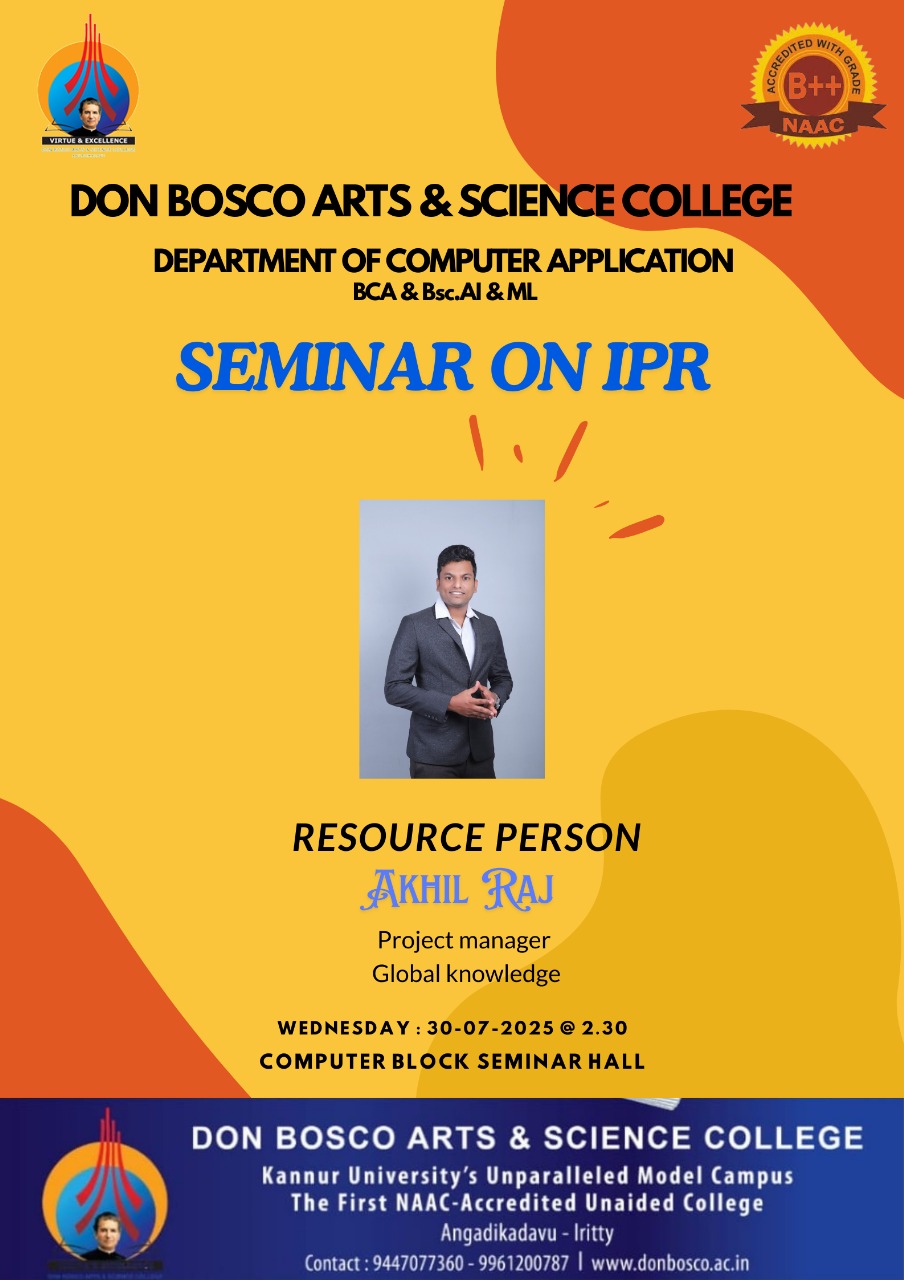 Department of Computer BCA and BSc AI & ML is organising a seminar Intellectual Property Rights on 30-07-2025 in the Computer Block Seminar Hall at 2:30PM Mr. Akhil Raj, Project Manger, Global Knowledge will be the resource person for the Seminar.