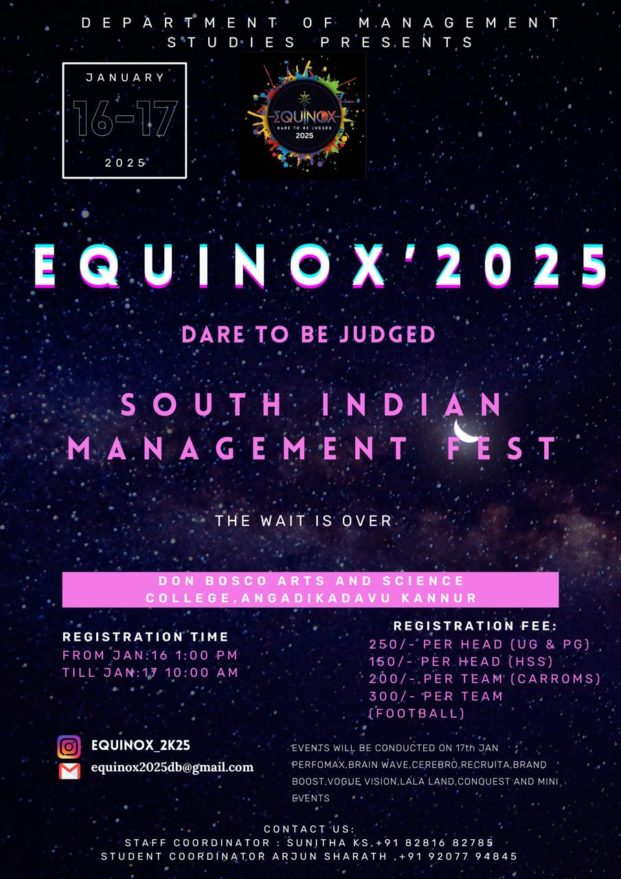 The South Indian Management Fest EQUINOX 2025 will be conducted in the college on 16 & 17 January 2025. Department of Management will be organising the event