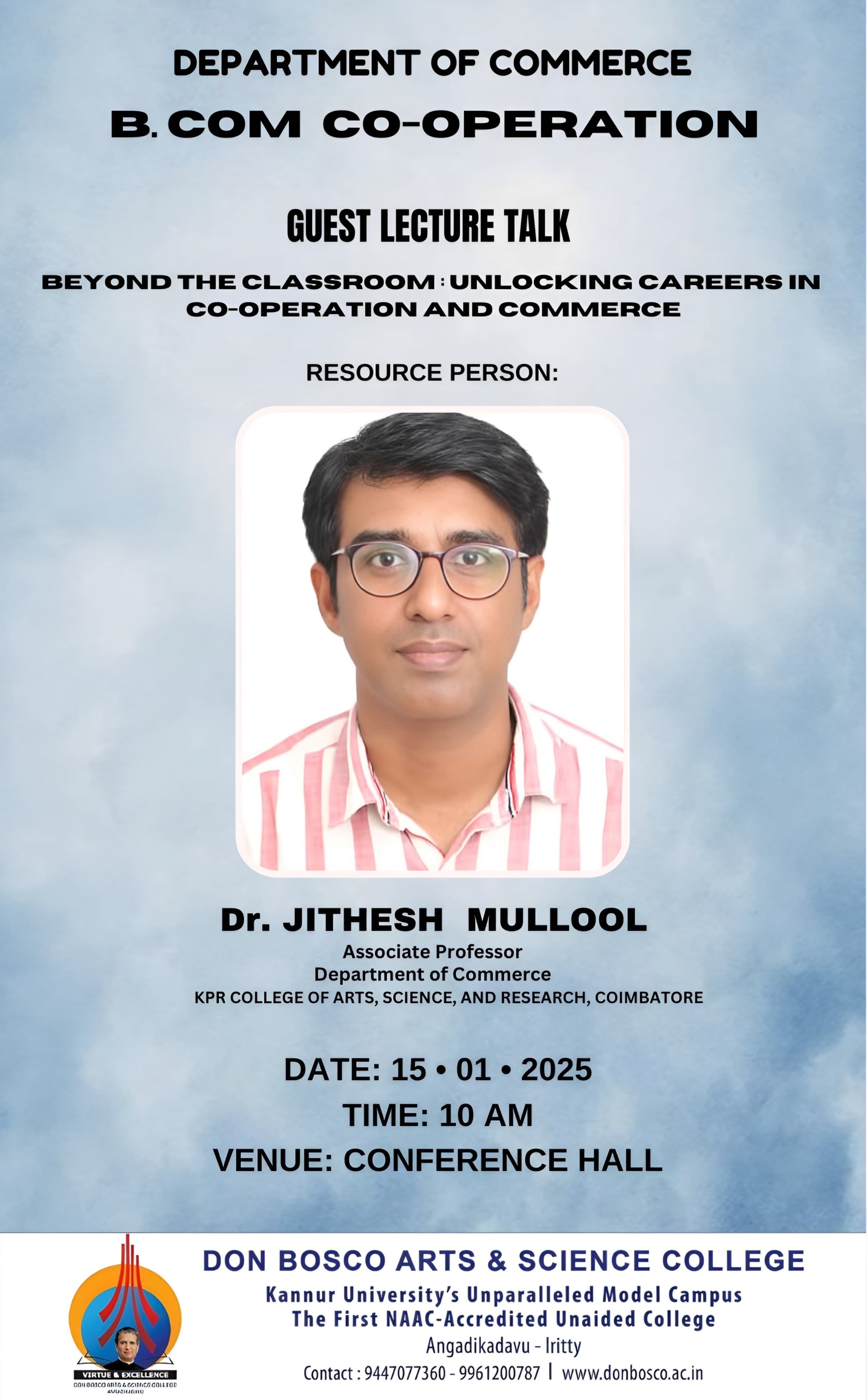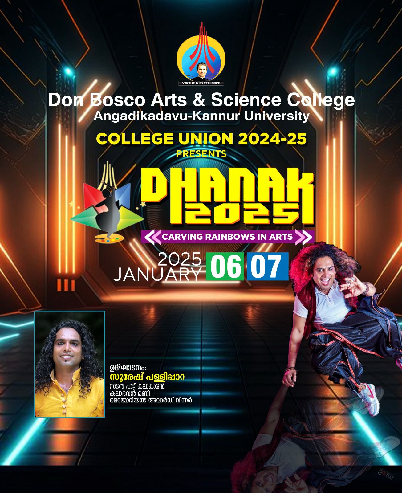 Don Bosco Arts & Science College will be celebrating the College Day-cum-Merit Day on 07-03-2025. Prof. Dr. KK Saju, Vice-Chancellor of Kannur University will be the Chief Guest for the Programme. During the Programme, Awards and scholarships will be distributed to the meritorious students who excelled in academics, sports or arts.