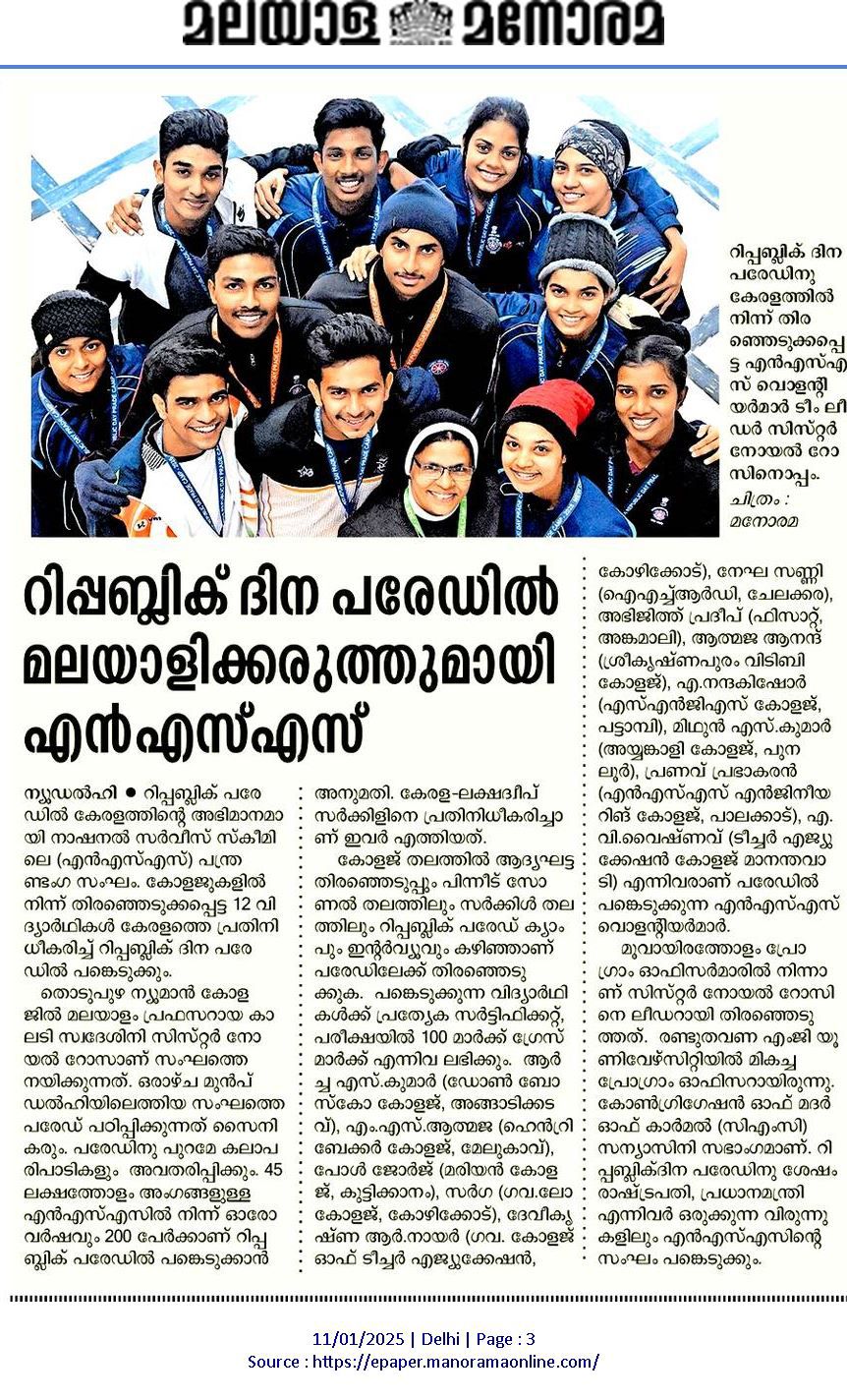 NSS volunteer Ms Aarcha S Kumar, BSc Psychology of Don Bosco Arts & Science College will be part of the 12 students team selected to participate the Republic Day Parade at New Delhi on 26-01-2025.