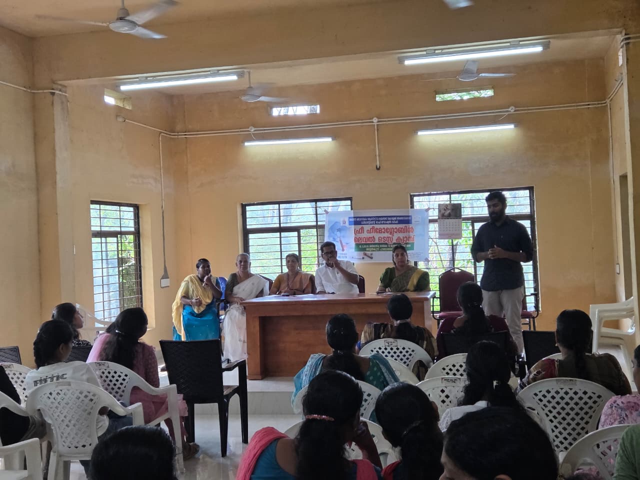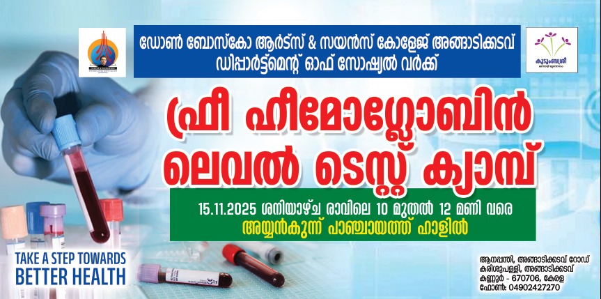 The first-year MSW students of Don Bosco Arts & Science College, Angadikadavu, Department of Social Work, successfully organized a Free Hemoglobin Level Test Medical Camp in collaboration with Primary Health Centre (PHC), Angadikadavu, and Kudumbashree Ayyamkunnu Unit. The camp was conducted on 15 November 2025 (Saturday) from 10:00 AM to 12:00 PM at the Ayyamkunnu Grama Panchayat Hall. The primary objective of the camp was to create health awareness among the local community and to promote preventive health practices, particularly focusing on anemia detection. Hemoglobin testing is a crucial indicator of overall health, especially for women, children, and vulnerable groups who are at higher risk of nutritional deficiencies.