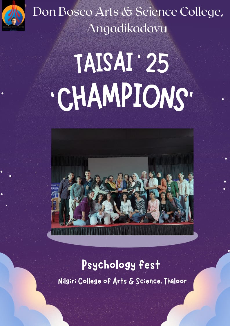 Students from Don Bosco Arts & Science College become champions of TAISAI 25, The Psychology Fest Conducted by Nilgiri College of Arts & Science, Thaloor