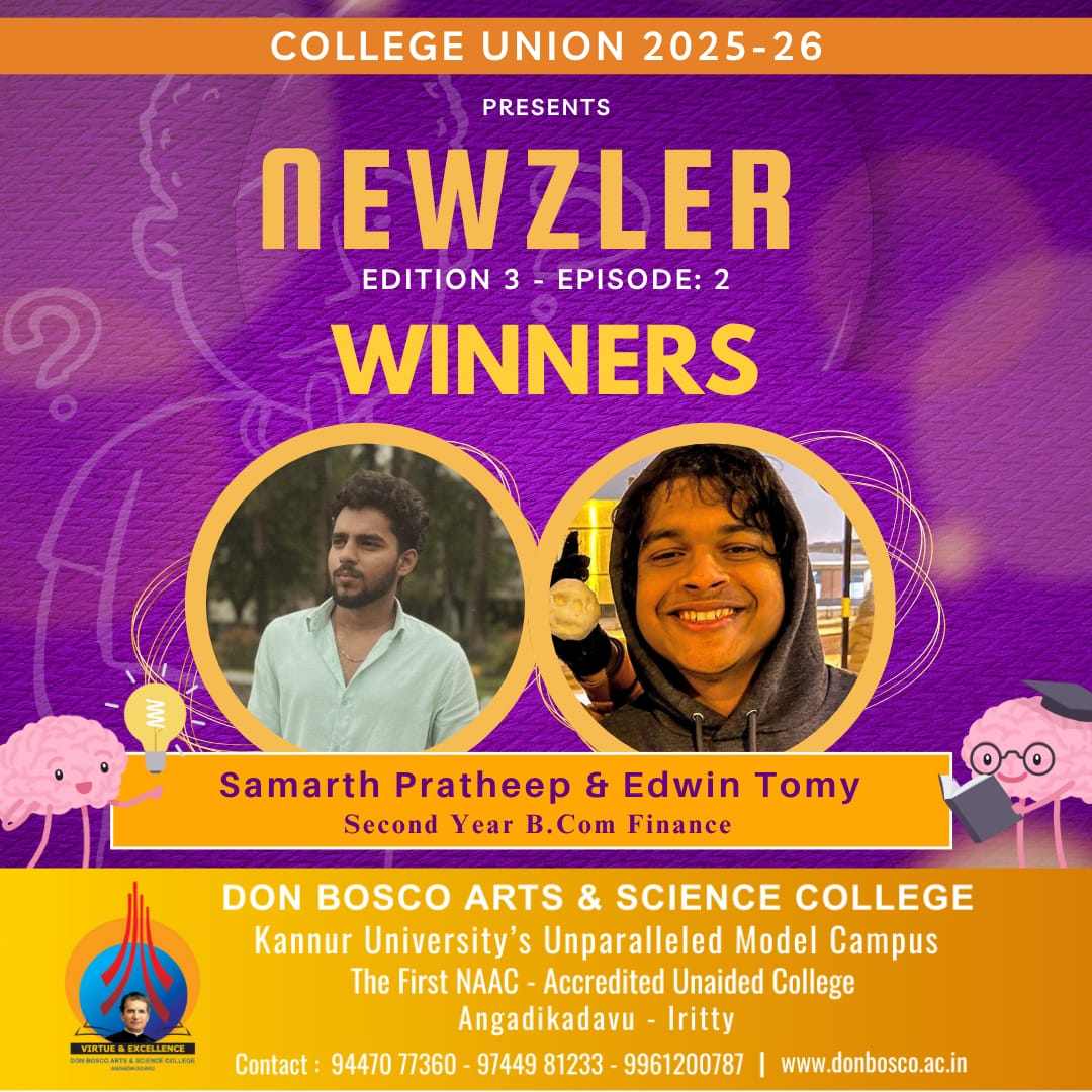 Edwin Tomy and Samarth Pradeep of BCom Finance become the winners for the second episode, third edition of NEWZLER QUIZ Series organised by College Union.