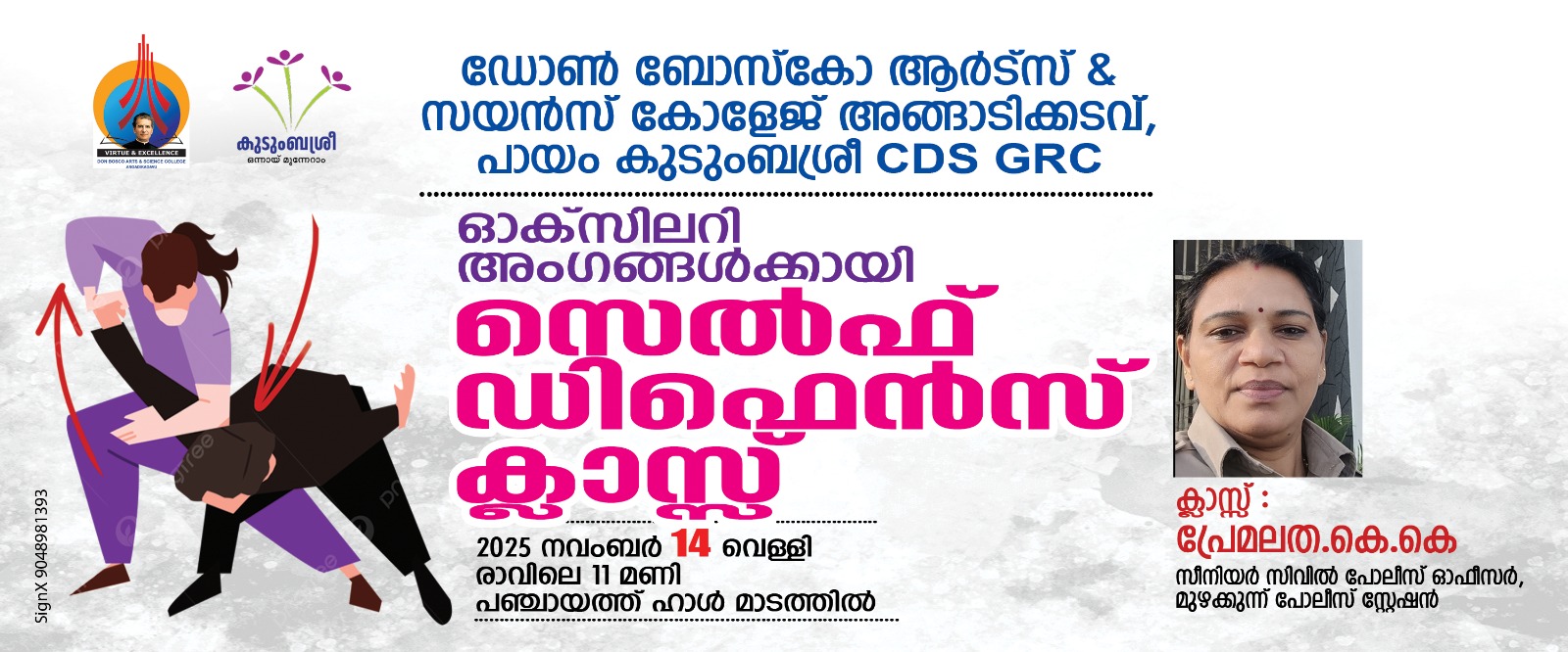 The Social Work Department of Don Bosco Arts & Science College, Angadikadavu, in collaboration with Kudumbashree Payam Unit (CDS–GRC), organized a Self-Defence Training Class exclusively for the Auxiliary Members of Payam Grama Panchayat. The programme was held on 14 November 2025 at 11:00 AM at the Panchayat Hall, Madathil. The programme was organised by First year MSW students. The session was led by Ms. Premalatha K.K, Senior Civil Police Officer, Muzhakkunnu Police Station. As an experienced officer, she delivered an impactful training that covered both theoretical and practical aspects of self-defence.