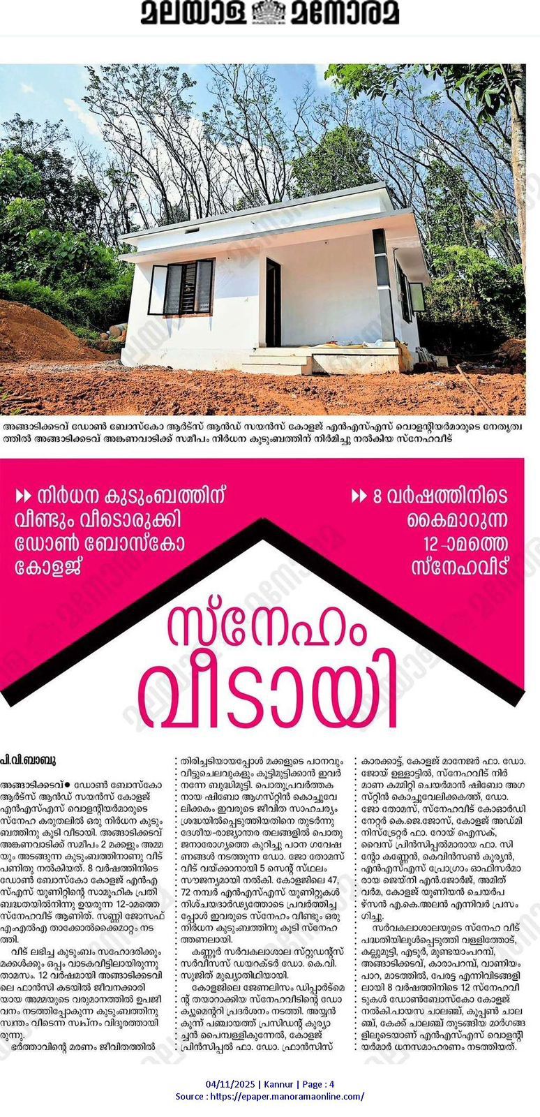 The dream of a mother who wanted the rain not to disturb her children's sleep came true yesterday. The shelter built by NSS volunteers from Don Bosco Arts and Science College became a haven for them. The key donation was made by Sunny Joseph MLA. The family was staying in a rented house with her sister and children. The young woman, who worked in a fancy shop, was not alone in her dream of owning a house. When her husband's death turned her life upside down, she struggled to pay for her children's education and household expenses. Dr. Joe Thomas, who conducts research on public health, donated five cents of land to build a house. This is the 12th Snehaveeda of NSS Units No. 47 and 72 at Don Bosco College, Angadikkadav. Dr. K.V. Sujith, Director, Student Services, Kannur University, was the chief guest. The gathering was addressed by Ayyankunnu Gram Panchayat President Kuryachan Paimpallikunnel, College Principal Rev. Dr. Francis Karakkat, College Manager Rev. Dr. Joy Ulattil, Snehaveed Construction Committee Chairman Shibo Augustine Kochuvelikkat, Dr. Joe Thomas, Snehaveed Coordinator K.J. Jose, College Administrator Fr. Roy Isaac, Vice Principals Fr. Sintro Kannen and K. Vinson Kurien, NSS Program Officers Janey N. George and Amit Verma, and College Union Chairperson A.K. Alan.