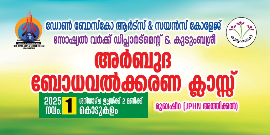 Department of Social Work, Don Bosco Arts & Science College Organised a Cancer Detection & Awareness Programme on November 01, 2025 in collaboration with Kudumbasree Kodukalam Unit. The class was handled by Ms. Mubasheera, JPHN, Athikkal.