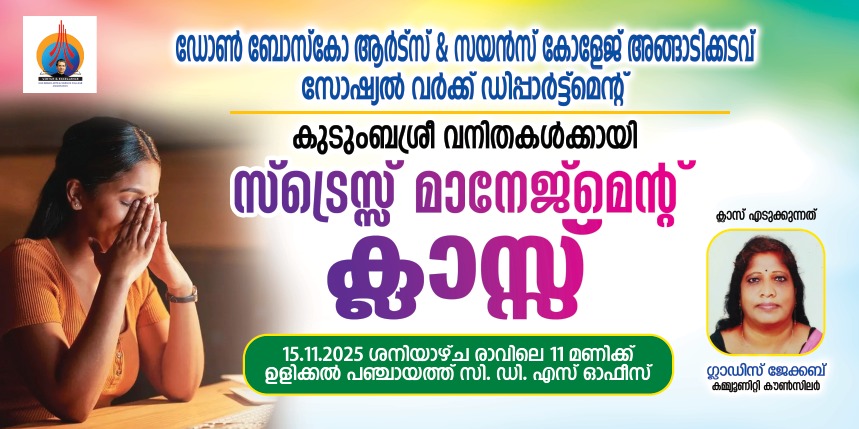 A Stress Management Class for Kudumbashree women was conducted at the Ulikkal Panchayat, C.D.S Office on 15 November 2025 at 11:00 a.m., organised by the MSW first year students of Don Bosco Arts and Science College, Angadikadavu. The programme aimed to support women in understanding stress and learning practical methods to cope with daily challenges. The session was handled by Mrs. Glenda Joby, Counselling Consultant, who provided an engaging and informative class on the causes of stress, its emotional and physical effects, and healthy ways of coping.