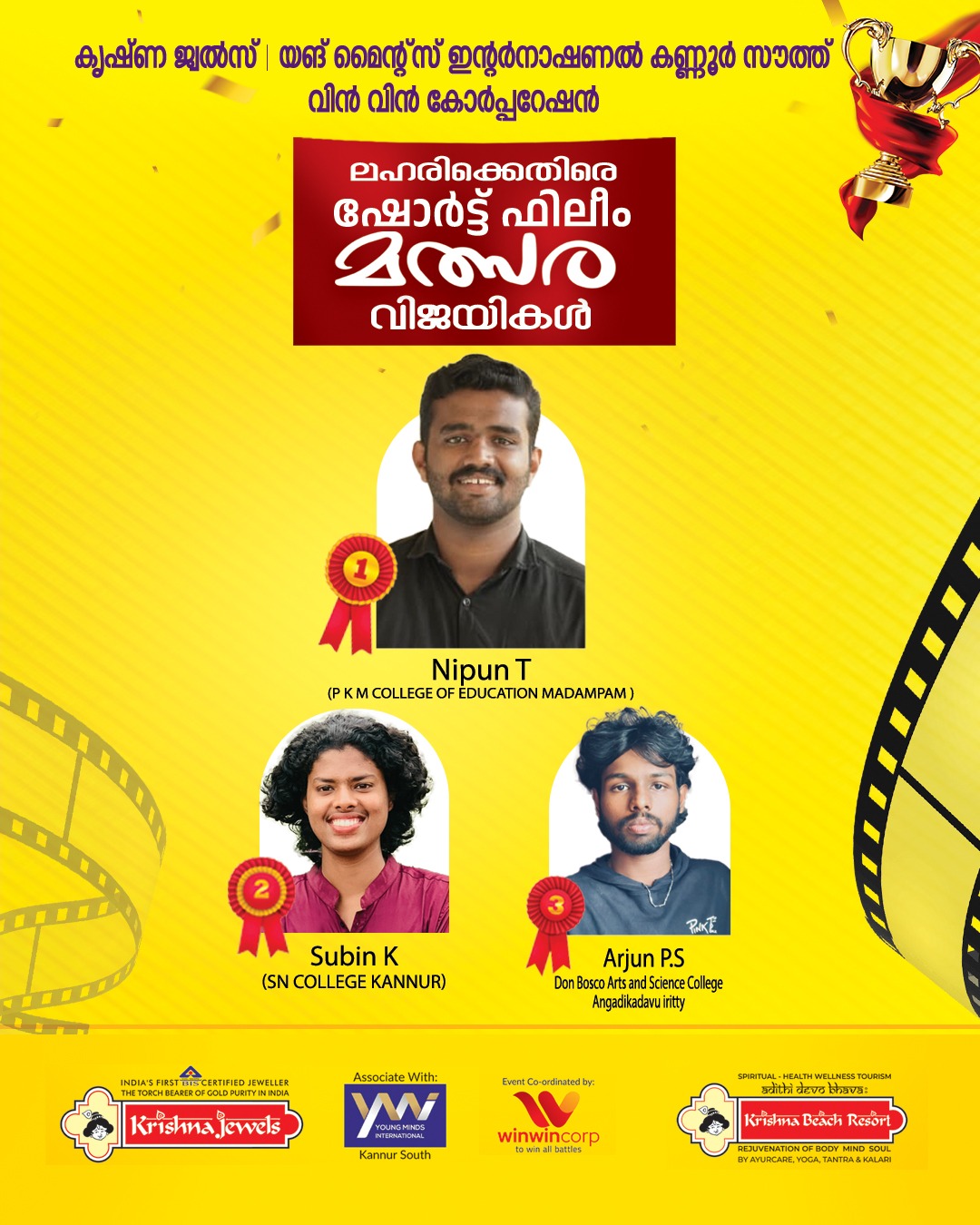 Arjun P.S. from BSc Psychology secured Third Prize in the Short Film Against Drug abuse Competition, organised by Young Minds International Kannur South Win-Win Corporation and Krishna Jewels