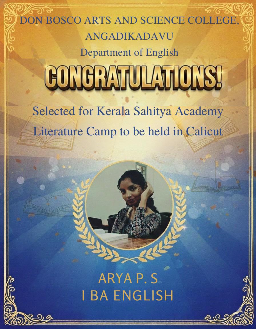 Arya P S, First Year Student of BA English is selected for Kerala Sahitya Academy Camp to be held in Calicut